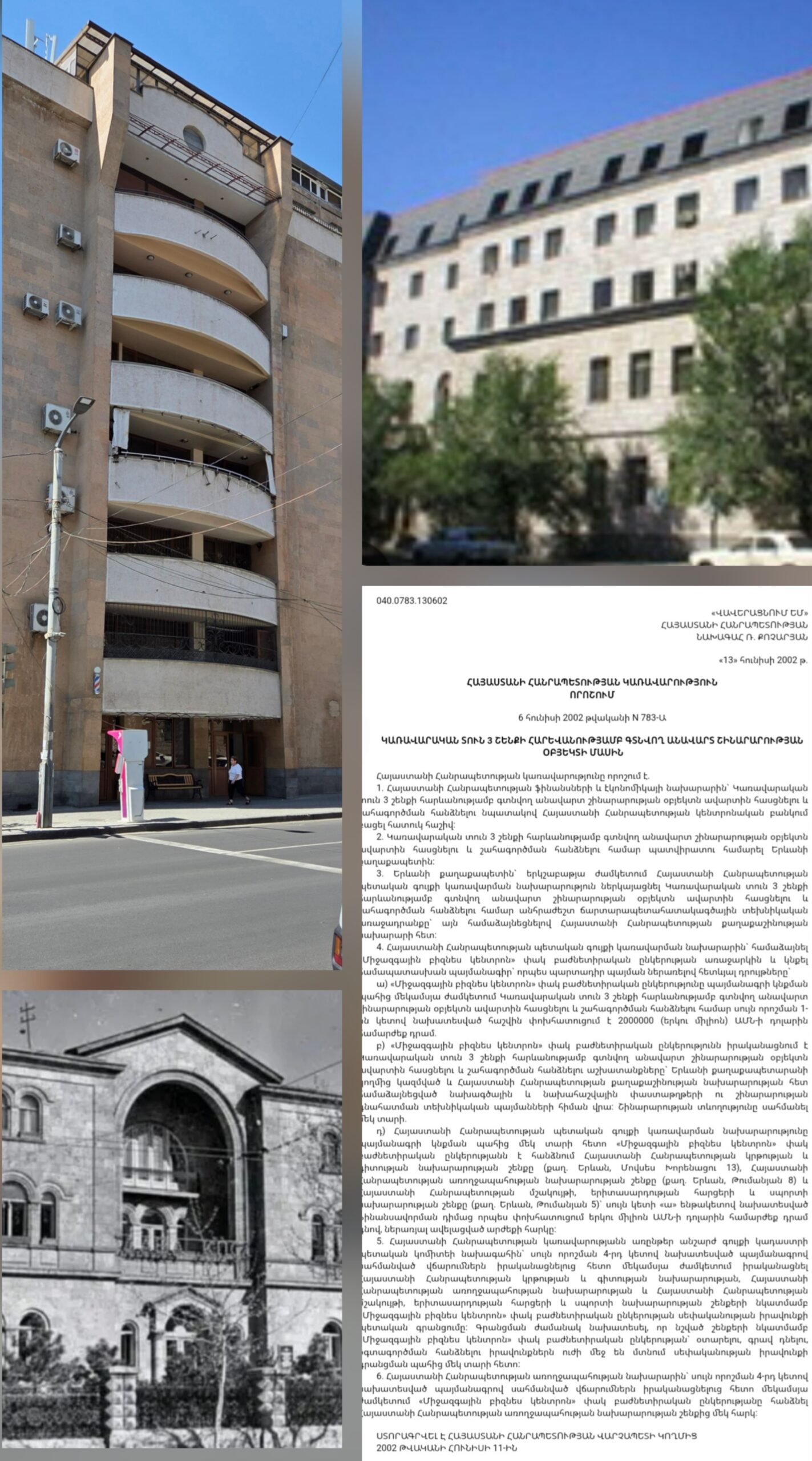 Կառավարության 06 հունիսի 2002 թիվ 783֊Ա որոշմամբ Ռոբերտ Քոչարյանը վավերացրեց 2 միլիոն ԱՄՆ դոլարով թվով 3 նախարարության շենքերի օտարումը` Առողջապահության` Թումանյան 8, Կրթության և գիտության` Խորենացի 13, Մշակույթի, սպորտի և երիտասարդության` Թումանյան 5 հասցեներում։