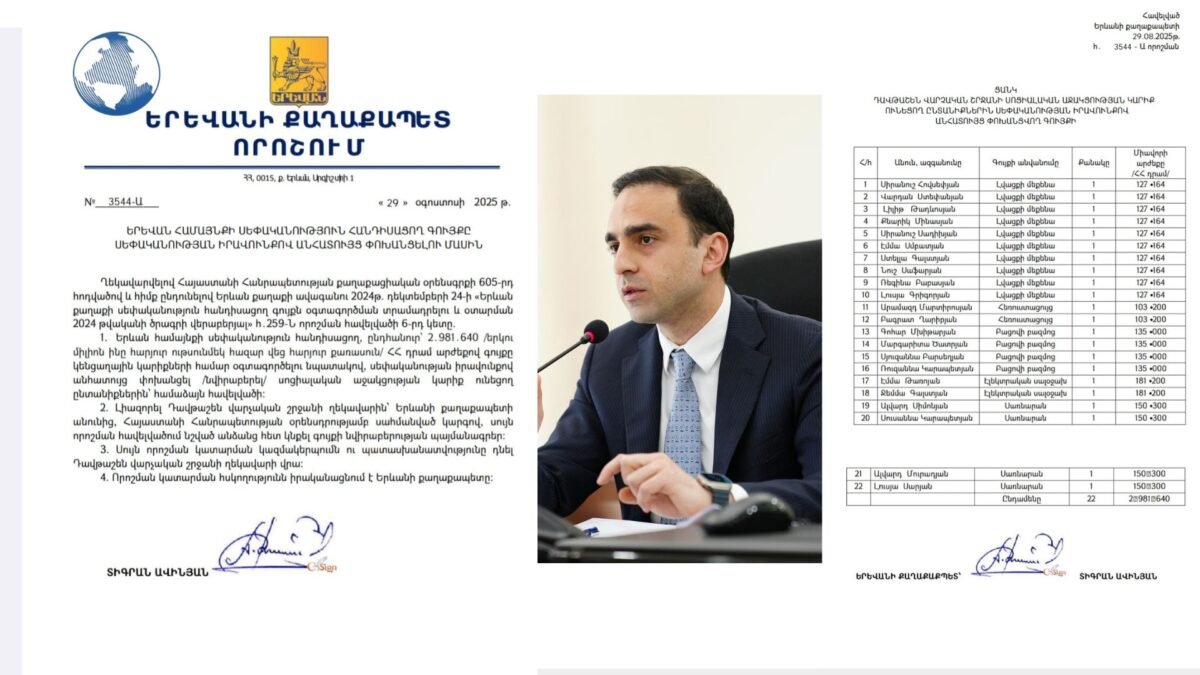 Երևանի քաղաքապետի 2025 թվականի օգոստոսի 29-ի որոշմամբ նախատեսվել է շուրջ 2.981.640 ՀՀ դրամ արժեք ունեցող գույք (լվացքի մեքենա, հեռուստացույց, բազմոց, սալօջախ, սառնարան) անհատույց տրամադրել սոցիալական աջակցության կարիք ունեցող ընտանիքներին։