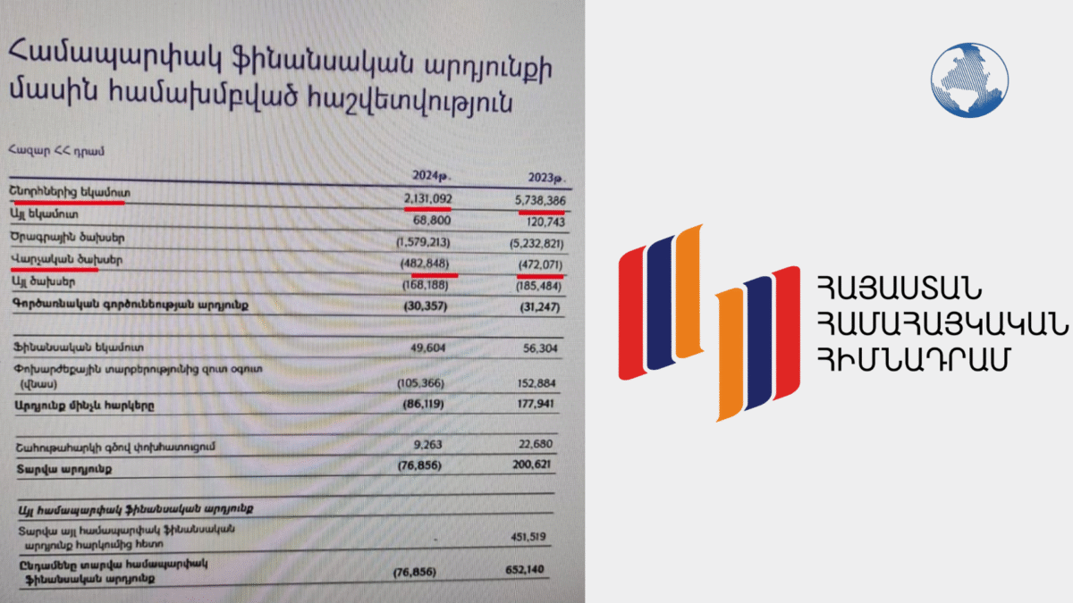 Ուսումնասիրելով «Հայաստան» համահայկական հիմնադրամի 2023 և 2024թթ ֆինանսական շարժերը՝ ակնատես ենք լինում բացասական երևույթի․ եթե 2023 թվականին հիմնադրամի շնորհներից եկամուտները կազմել են 5 միլիարդ 738 միլիոն դրամ, ապա 2024 թվականին դրանք կազմել են 2 միլարդ 131 միլիոն դրամ՝ 2․7 անգամ պակաս։