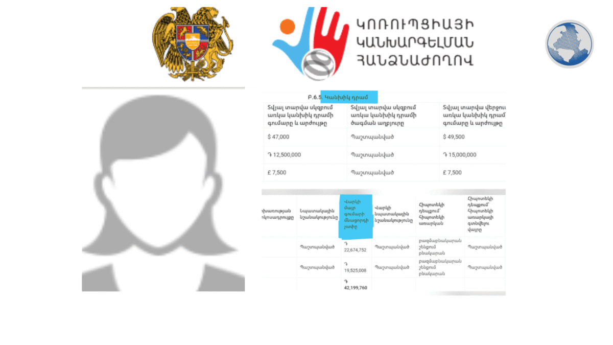 Ներկայացվում է հատված  հայտարարագրից (տես լուսանկարը), որտեղ պաշտոնատար անձը «Կանխիկ դրամի» բաժնում հավաստում է, որ հաշվետու տարվա վերջում ունի 49․500 ԱՄՆ դոլար,15․000․000 դրամ, 7․500 եվրո, միաժամանակ «Ստացված վարկերի և փոխառությունների» բաժնում հայտարարատուն  արտացոլում է 42․2 միլիոն դրամի վարկ։