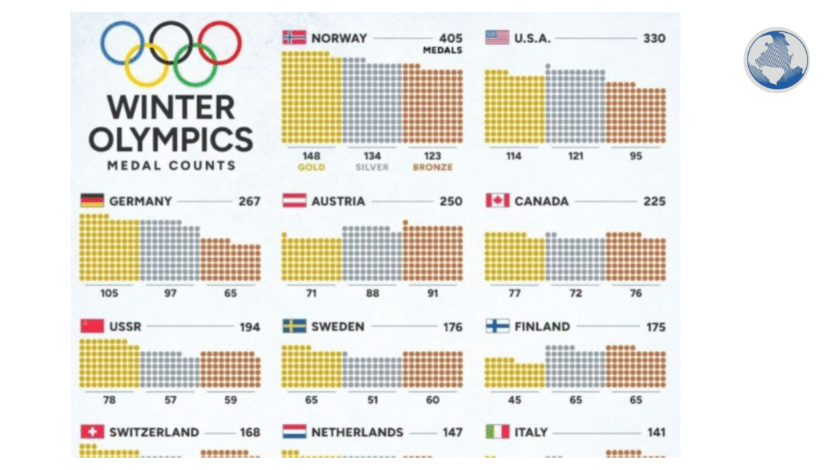 Նորվեգիան հարմարավետորեն զբաղեցնում է առաջին տեղը՝ 405 մեդալով, որոնցից 148-ը ոսկե են՝ նվաճված 24 Ձմեռային օլիմպիական խաղերում։