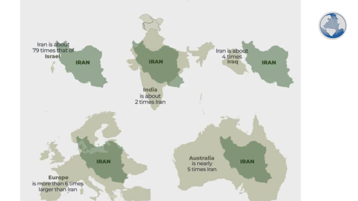 Իրանի տարածքը 79 անգամ մեծ է Իսրայելի տարածքից (22,000 քառակուսի կիլոմետր): Միևնույն ժամանակ, Միացյալ Նահանգները (9.8 միլիոն քառակուսի կիլոմետր) մոտավորապես վեց անգամ մեծ է Իրանից: