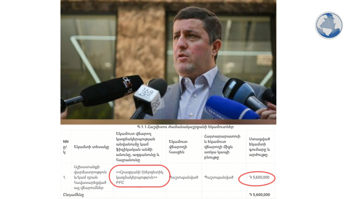 Համաձայն վերջինիս հայտարարագրի՝ նա, ըստ երևույթին, ոչ մի րոպե անգործ չի մնացել՝ աշխատանքի անցնելով «Հրազդանի էներգետիկ կազմակերպություն» ԲԲԸ-ում, որը ևս պատկանում է Սամվել Կարապետյանի էներգետիկ մեծ կայսրությանը։